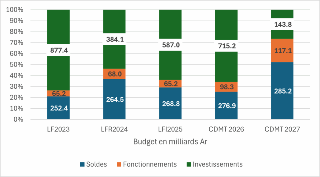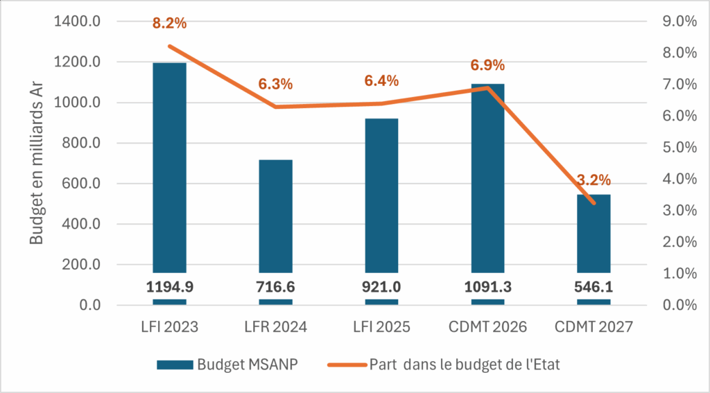 Le budget de l’ensemble des trois ministères en charge du secteur éducatif s’élève à 1 942,5 milliards Ar et enregistre une légère hausse de +1,1% par rapport à la LFR2024. Les prévisions du CDMT 2026 – 2027 prévoient des révisions à hausse des allocations, toutefois le budget prévu reste encore loin des engagements internationaux d’allouer 20% du budget de l’Etat à l’éducation.